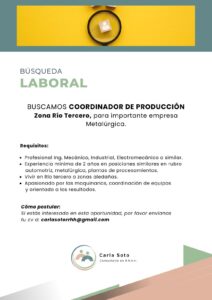 • Experiencia mínima de 2 años en posiciones similares en rubroaumotriz, metalúrgica, plantas de procesamiento.